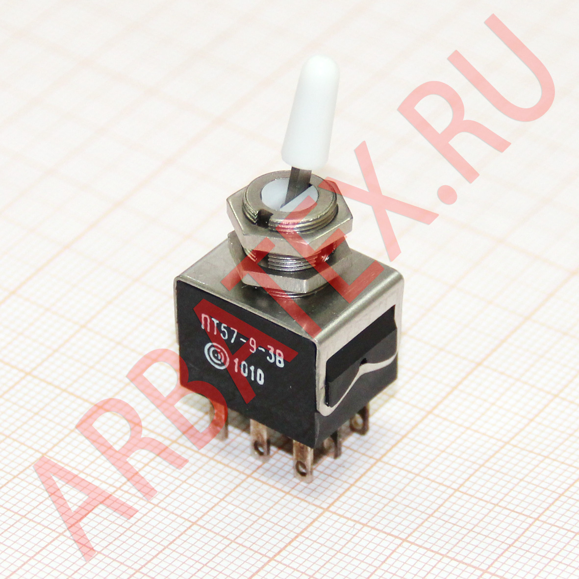 ПТ57-9-3В переключатель тумблерный, применяется для коммутации цепи сигнализации, питания и управления с напряжением 1х10-4В - 250В, силой тока 1х10-6А - 16А и коммутируемой мощностью до 1900Вт. Тумблеры выполняются с рычажным приводом, позволяющим укреплять резиновый защитный протектор и так и без него. В зависимости от фиксации рычага тумблеры выпускаются с фиксацией в трех положениях, в одном крайнем и среднем положениях и только в среднем положении. Монтаж проводов проводится пайкой.