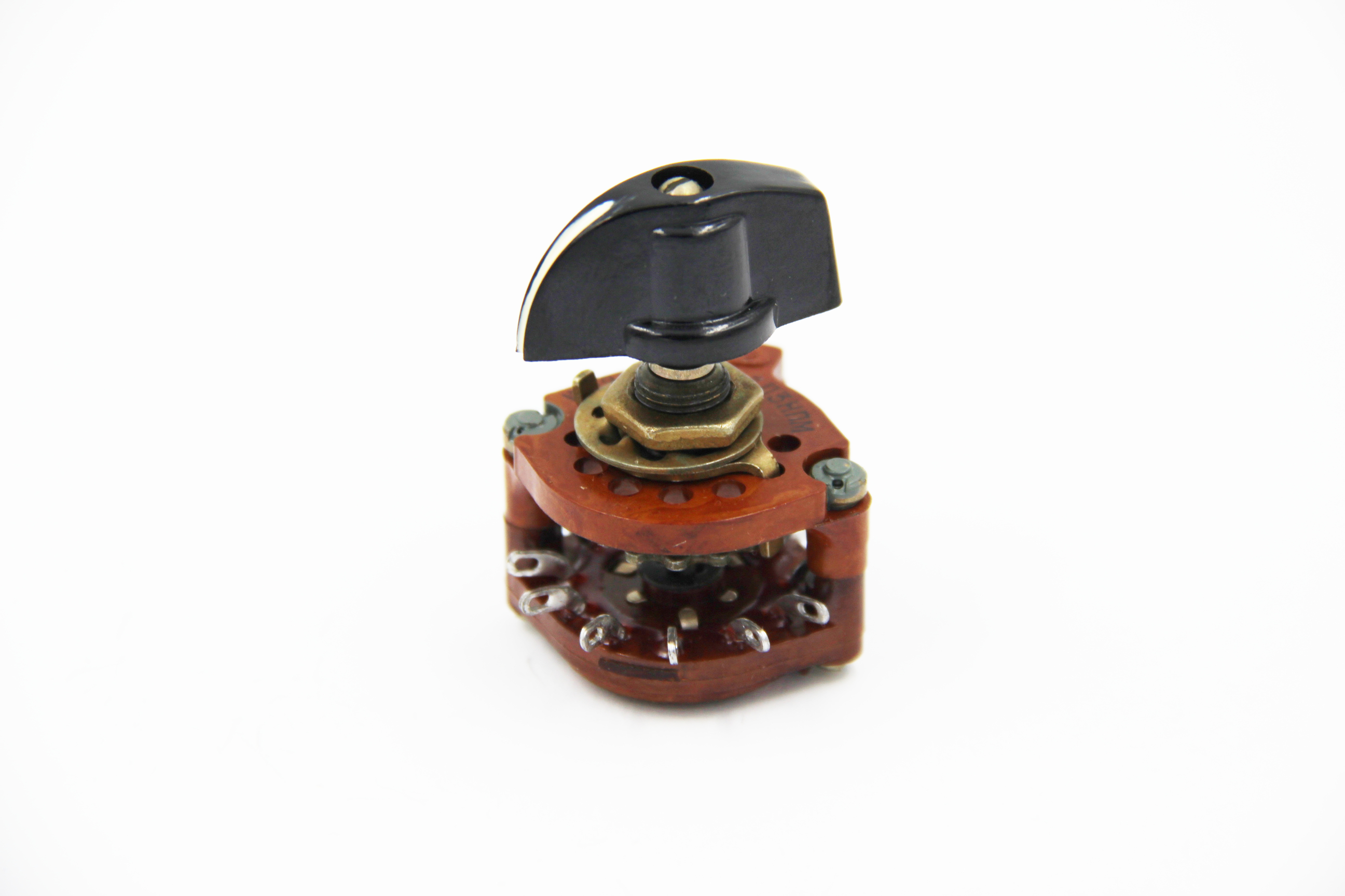 ПМ-3П3Н переключатель галетный карболитовый, малогабаритный, применяется для коммутации цепей сигнализации и управления с напряжением до 300В, силой тока до 2А и коммутируемой мощностью до 25Вт. Переключатель обеспечивает поворотное переключение контактов, расположенных на галетах. Метод монтажа путем фиксации оси в отверстии панели.
