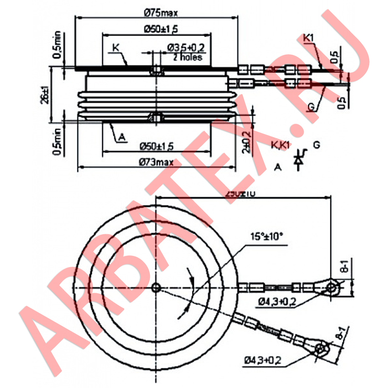 Полярность тиристора определяется по значку на корпусе.